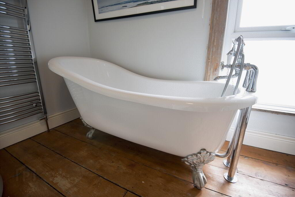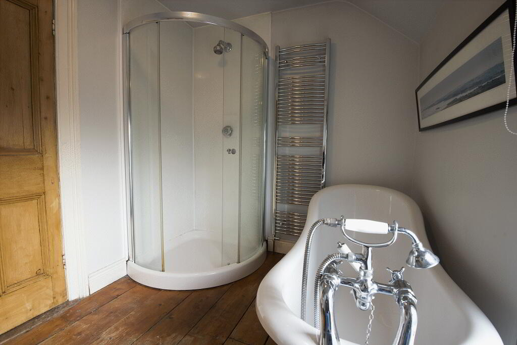 BATHROOM: Classic white suite comprising claw foot bath with chrome telephone hand shower attachment. Pedestal wash hand basin. Separate shower quadrant with chrome shower head. Extractor. Solid wooden floor. Chrome heated towel rail.