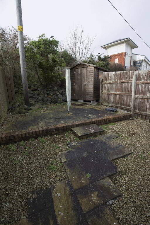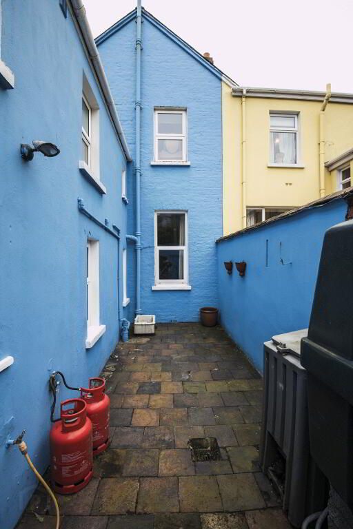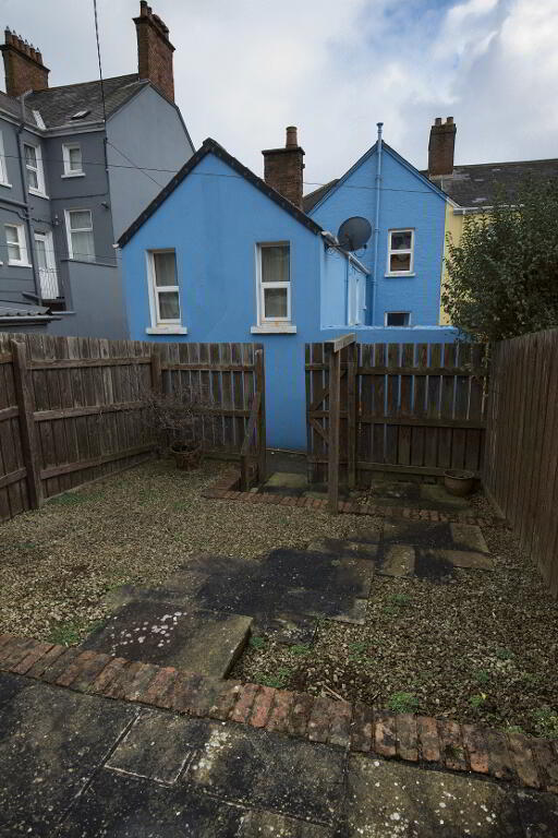 3). Rear garden area in stones and flagging enclosed by wooden fencing. Wooden garden shed. Outside light.