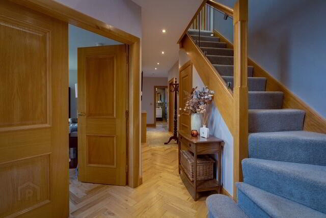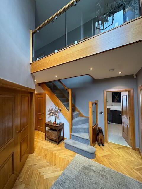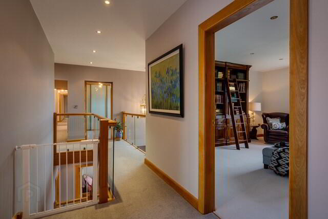ENTRANCE HALL: 28’0” x 12’3”. Entrance hall with vaulted ceiling. Stairwell off. Cloaks off with light. Two smoke alarms. Recessed down-lighting. Solid oak herringbone floor. Two radiators. Galley style landing. Glazed balustrade.