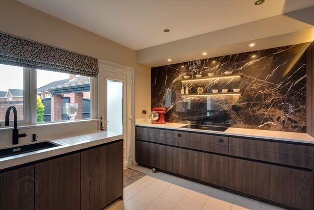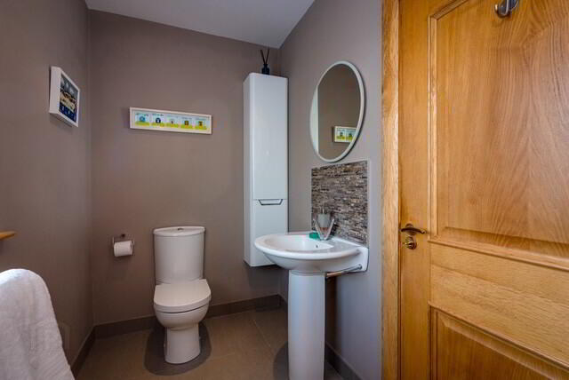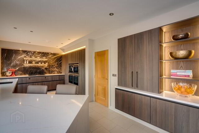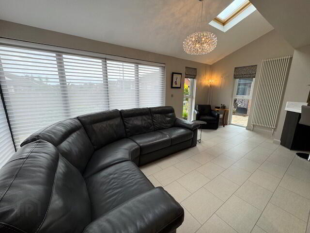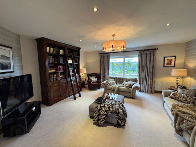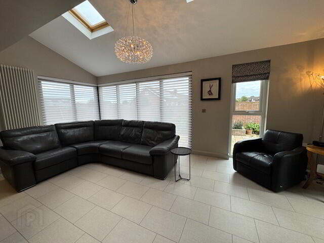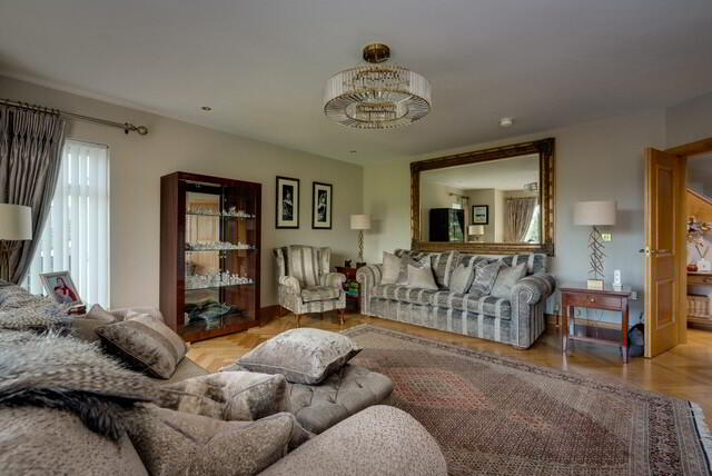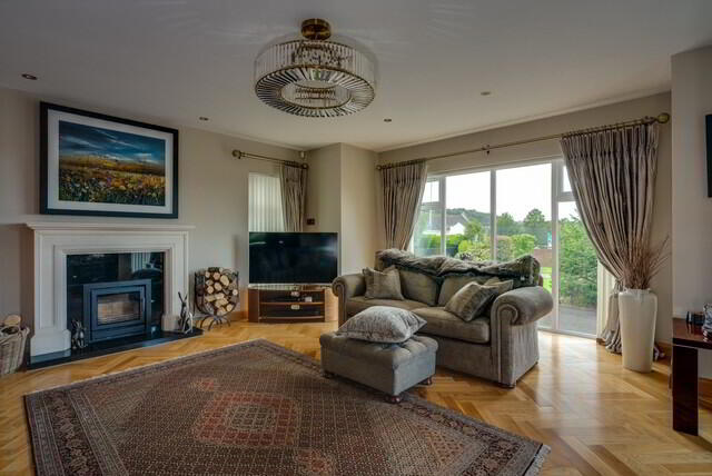 LOUNGE: 19’9” x 17’10”. Wood burner with limestone surround and polished granite inset and hearth. Telephone point. Smoke alarm. Two TV aerial sockets. Recessed down-lighting and automated lighting system. Solid oak herringbone floor. Radiator. Beautiful far-reaching views across Bentra Golf Course and Larne Lough.