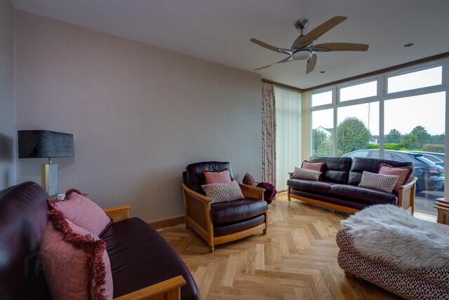 SITTING ROOM: 17’4” x 10’0”. Solid oak herringbone floor. Ceiling fan. Radiator. Far-reaching views across Bentra Golf Course and Larne Lough.