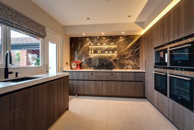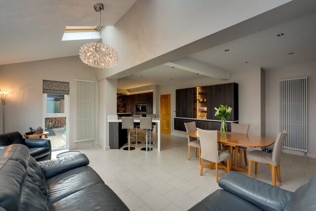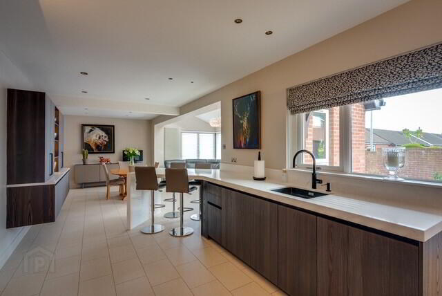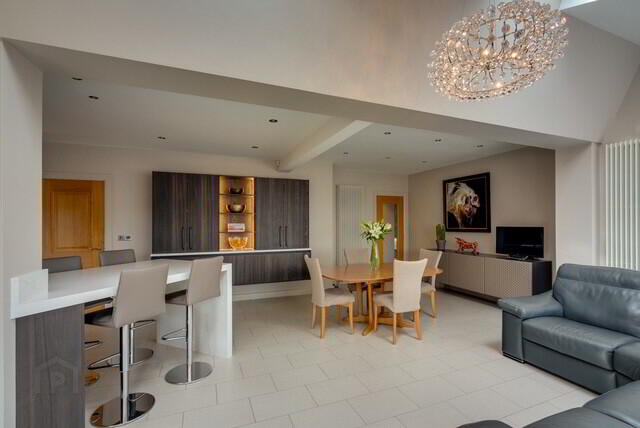 KITCHEN/ DINING/ SNUG : 33’3” x 21’2”. Bespoke hand-built ‘Leicht’ kitchen by Robinson Interiors with range of high and low level pantry style cupboards and polished quartz work surfaces. Single ‘Franke’ composite sink unit with ‘Quooker’ tap. Waterfall breakfast bar. Integrated double waist-level ‘Siemens’ oven, integrated ‘Siemens’ microwave oven and ‘Siemens’ coffee machine. ‘Bora’ induction hob with marble splash-back. Integrated ‘Liebherr’ fridge freezer. Integrated ‘Siemens’ dishwasher. Recessed down-lighting. Smoke alarm. Automated lighting system. Dimmer controlled lighting. Telephone point. TV aerial socket. Broadband connection. Automatic blinds. Two ‘Velux’-type roof lights. ‘Karndean’ tiled floor. Three radiators. UPVC double glazed entrance door accessing rear garden area. Composite bi-folding doors accessing rear garden area.