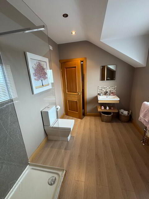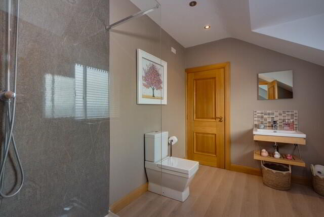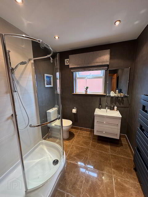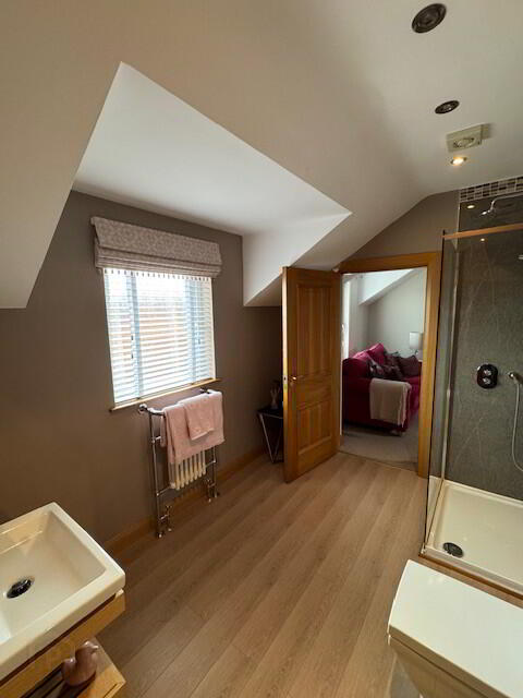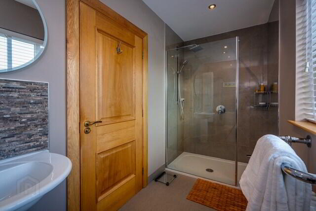 EN-SUITE: 12’8” x 5’0”. Modern white suite comprising double shower cubicle with chrome drench shower and hand shower fitment. Pedestal wash hand basin and low flush wc. Extractor. Recessed down-lighting. Towel radiator.