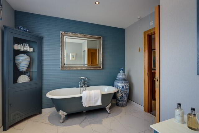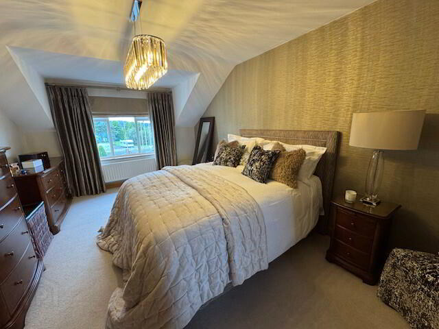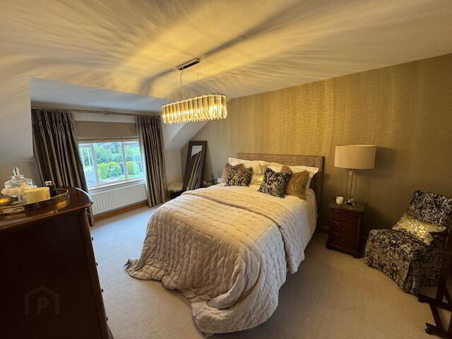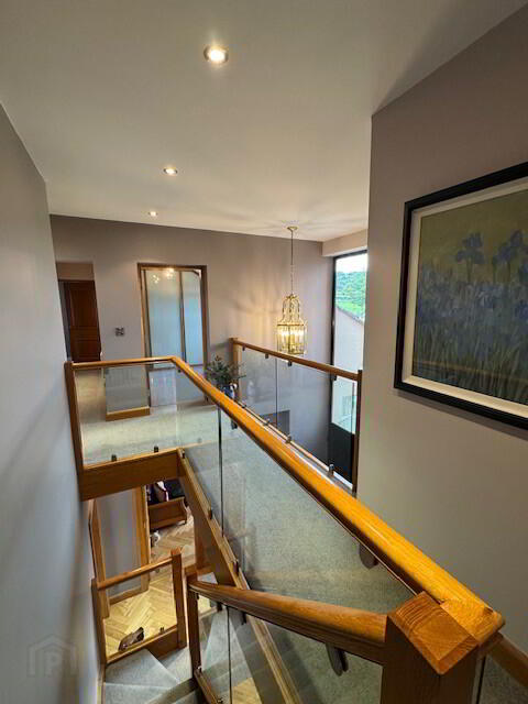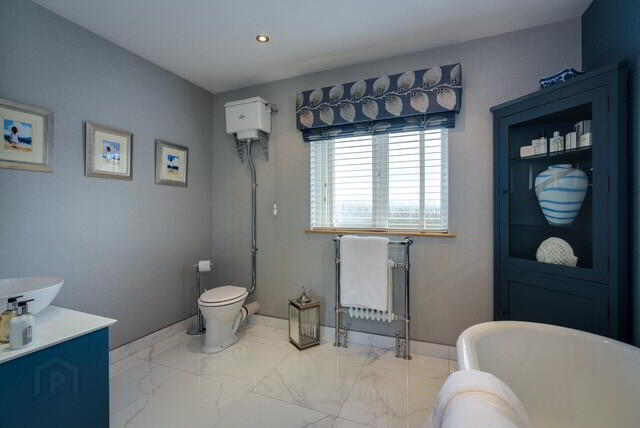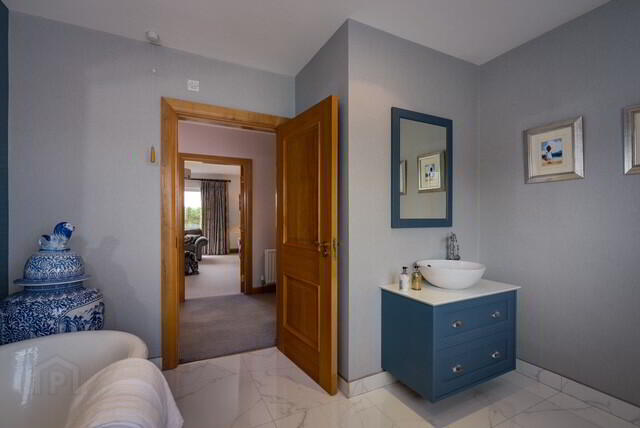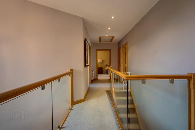 LANDING: Smoke alarm. Recessed down-lighting. Hot press off with water storage tank and immersion heater. Two radiators. Access to roof space. Fabulous views across Bentra Golf Course.