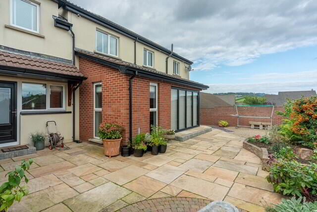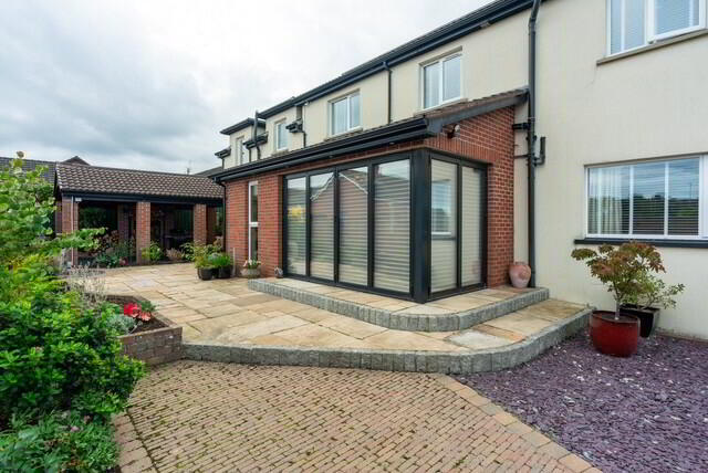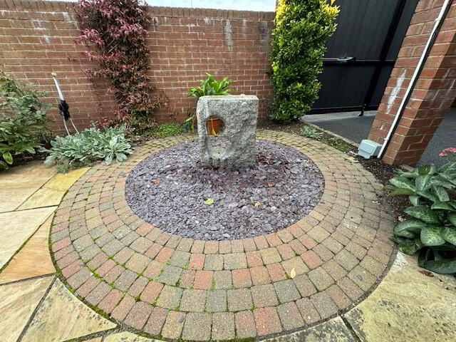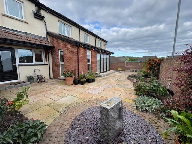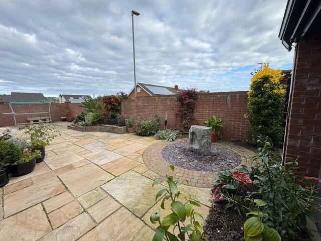2.) Rear landscaped garden in ‘Tobermore’ stone flagging and paviors with raised flower beds enclosed by red brick wall. Vintage Royal Mail post box. Water feature. External sockets. Outside lights. Electric composite gates accessing car port and integral garage. Wooden potting shed to side. Outside tap.