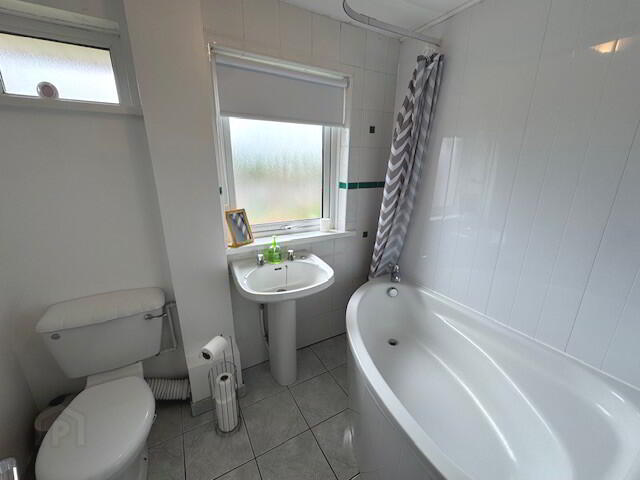 BATHROOM: 7’7” x 3’5”. Modern white suite comprising corner bath with electric “Triton” overhead shower and shower curtain rail. Pedestal wash hand basin and low flush wc. Partial uPVC wall panelling. Tiled floor. Chrome heated towel rail.