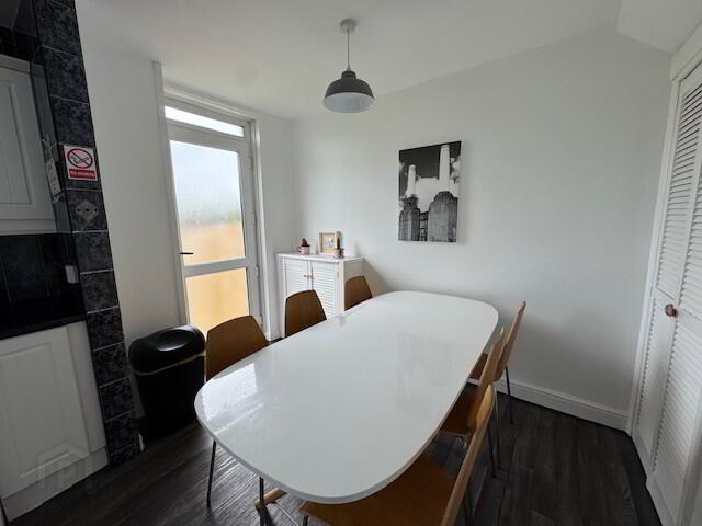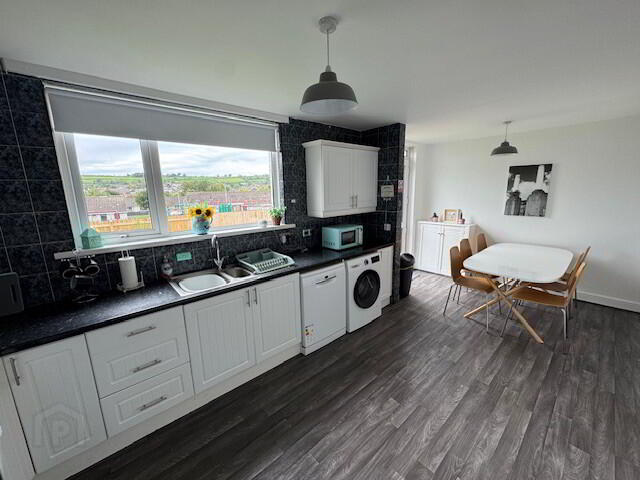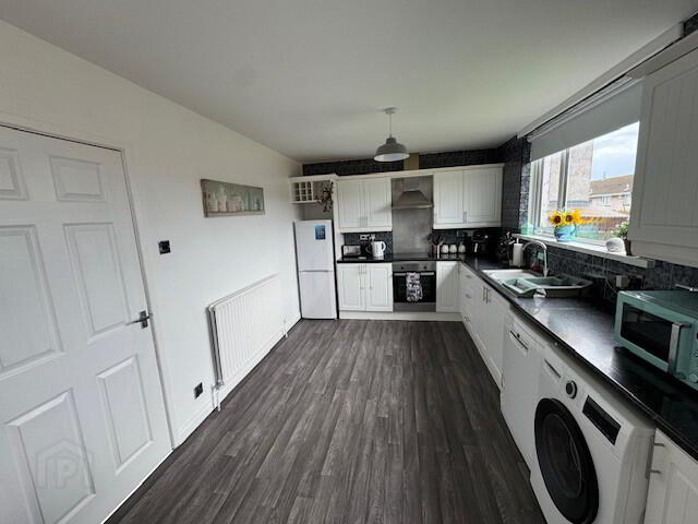KITCHEN / DINING: 19’8” x 9’6”. Modern fitted kitchen with range of high and low level cupboards and contrasting laminate work surfaces. Single drainer bowl and ½ stainless steel sink unit. Integrated ‘Beko’ under-oven and 4-ring ceramic hob with stainless steel extractor hood and splash-back. Plumbed for dishwasher and washing machine. Fridge freezer space. Built-in storage cupboard. Partial wall tiling. Wood-effect floor covering. Radiator. UPVC double glazed entrance door accessing rear garden. Pleasant sea views across Belfast Lough.
