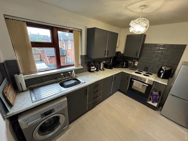 KITCHEN: 10’10” x 8’8”. Modern fitted kitchen with range of high and low level cupboards and contrasting laminate work surfaces. Stainless steel sink unit and drainer. Integrated “Bush” under-oven and 4-plate ceramic hob. Fridge/freezer space. Plumbed for washing machine. Extractor. Partial wall tiling. Wood-effect floor covering. Radiator.