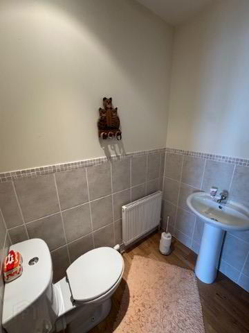 DOWNSTAIRS WC: 7’4” x 6’5”. Modern white comprising pedestal wash hand basin and low flush wc. Partial wall tiling. Tiled floor. Radiator.