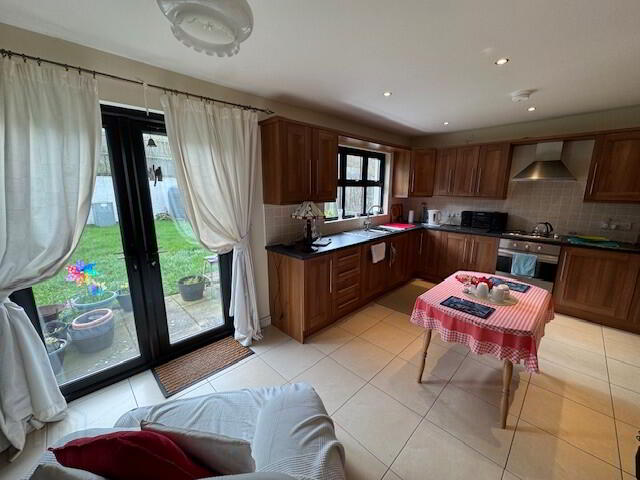 KITCHEN / DINING: 18’6” x 11’7”. Modern fitted kitchen with range of high and low level cupboards and contrasting laminate work surfaces. Integrated stainless steel “Tricity Bendix” under-oven and 4-plate ceramic hob. Stainless steel extractor hood. Single drainer bowl and ½ stainless steel sink unit and mixer tap. Fridge freezer space. Integrated “Neff” dishwasher. Smoke alarm. Partial wall tiling. Recessed down-lighting. Tiled floor. Two radiators. UPVC double glazed patio doors to rear garden.