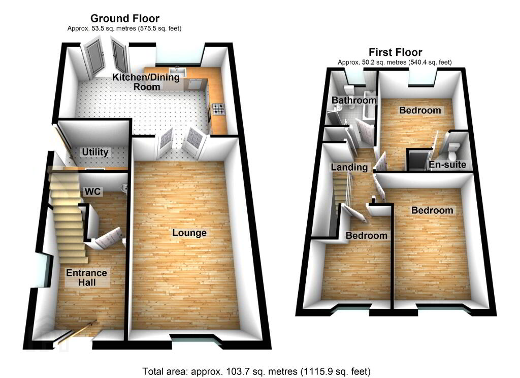 UTILITY: 7’4” x 5’6”. Modern fitted utility with under-unit storage and laminate work surface. Single drainer stainless steel sink unit and mixer tap. Plumbed for washing machine. Freezer space. Smoke alarm. Extractor. Partial wall tiling. Tiled floor. Radiator. UPVC entrance door accessing side of property.