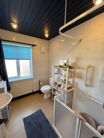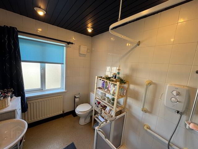 SHOWER ROOM: 8’9” x 6’4”. Modern white suite comprising walk-in double shower cubicle with ‘Triton’ electric shower unit, pedestal wash hand basin and low flush wc. Spotlighting. Wood panelled ceiling. Fully tiled walls. Waterproof non-slip floor covering. Radiator.