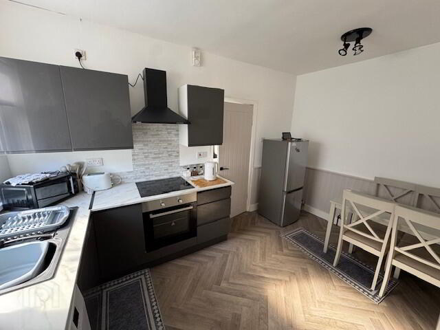 REAR HALLWAY: 9’6” x 4’6”. Smoke alarm. Wood-effect floor. Radiator. UPVC entrance door accessing rear garden.