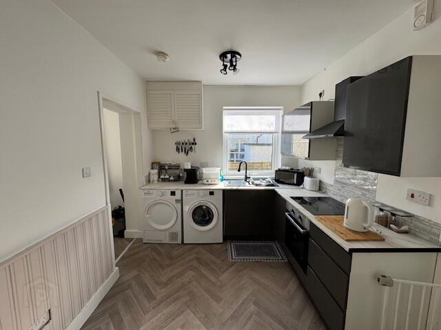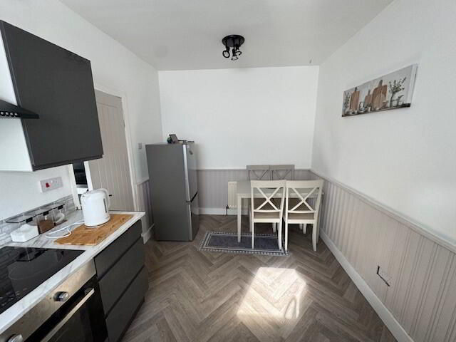 KITCHEN/ DINING: 13’2” x 8’8”. Modern fitted kitchen with range of high and low level cupboards and contrasting laminate work surfaces. Single drainer composite sink unit and mixer tap. Integrated stainless steel under-oven and 4-plate ceramic hob with integrated extractor hood. Fridge/ freezer space. Plumbed for dishwasher and tumble dryer. Spotlighting. Partial wood panelling. Wood-effect floor covering. Radiator.