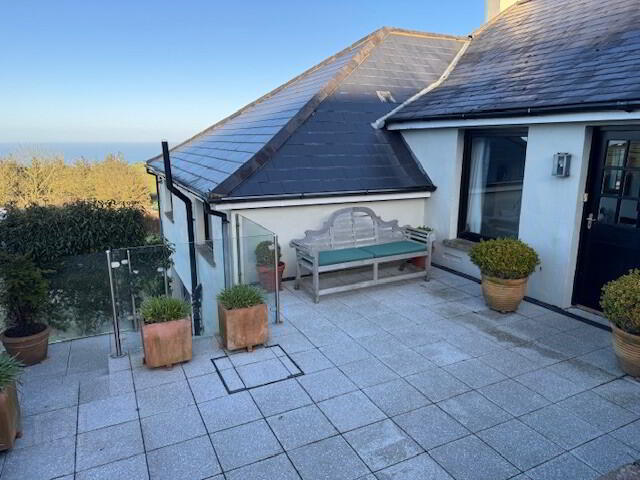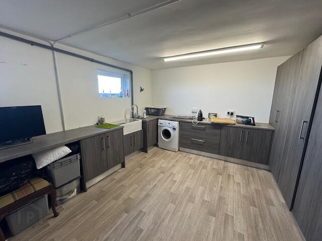 UTILITY: 18’7” x 13’9”. Built-in storage cupboards and drawers with contrasting laminate work surfaces. ‘Belfast’ sink with chrome mixer tap. Plumbed for washing machine. OFCH boiler. Wood-effect floor covering. Sea views. Wooden concertina doors to: