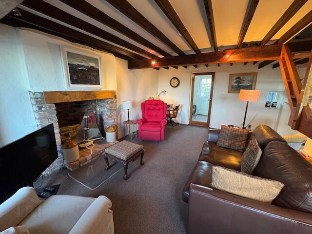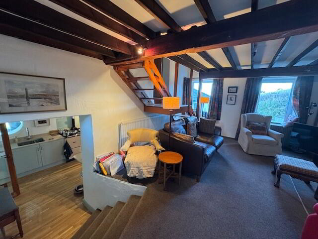 SITTING ROOM/ SNUG: 18’0” x 13’0”. Feature brick fireplace. TV aerial socket. Beamed ceiling. Radiator. Stairs down to kitchen. Wooden staircase up to: