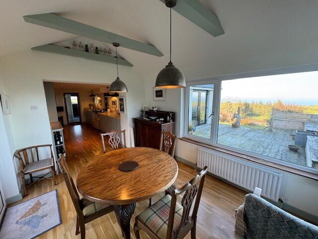DINING ROOM: 12’8” x 9’5”. Beamed ceiling. Solid oak floor. Radiator. UPVC entrance door accessing rear patio. Fabulous sea views.