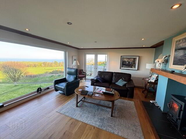 LOUNGE: 18’10” x 15’1”. Feature fireplace with cast iron multi-burning stove set on slate hearth with solid wooden mantle. TV aerial socket. Recessed down-lighting. Dimmer controlled lighting. Solid wooden floor. Two radiators. UPVC double glazed patio doors accessing wooden decked area to side. Breathtaking panoramic sea views across the North Channel and famous Gobbin’s Path.