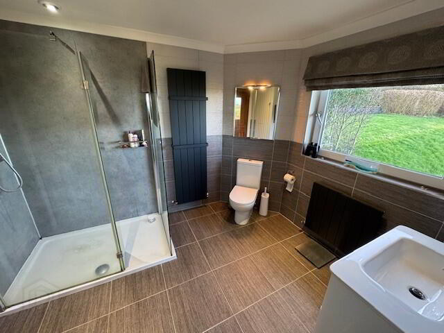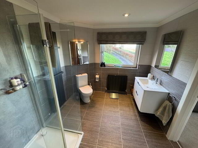 EN-SUITE: 9’10” x 8’3”. ‘Jack and Jill’ en-suite with bespoke white suite comprising double shower cubicle with chrome shower fitment, wash hand basin and low flush wc. Extractor. Recessed down-lighting. Tiled floor. Two radiators. Hot press off comprising insulated copper tank. Fabulous sea views across the North Channel.